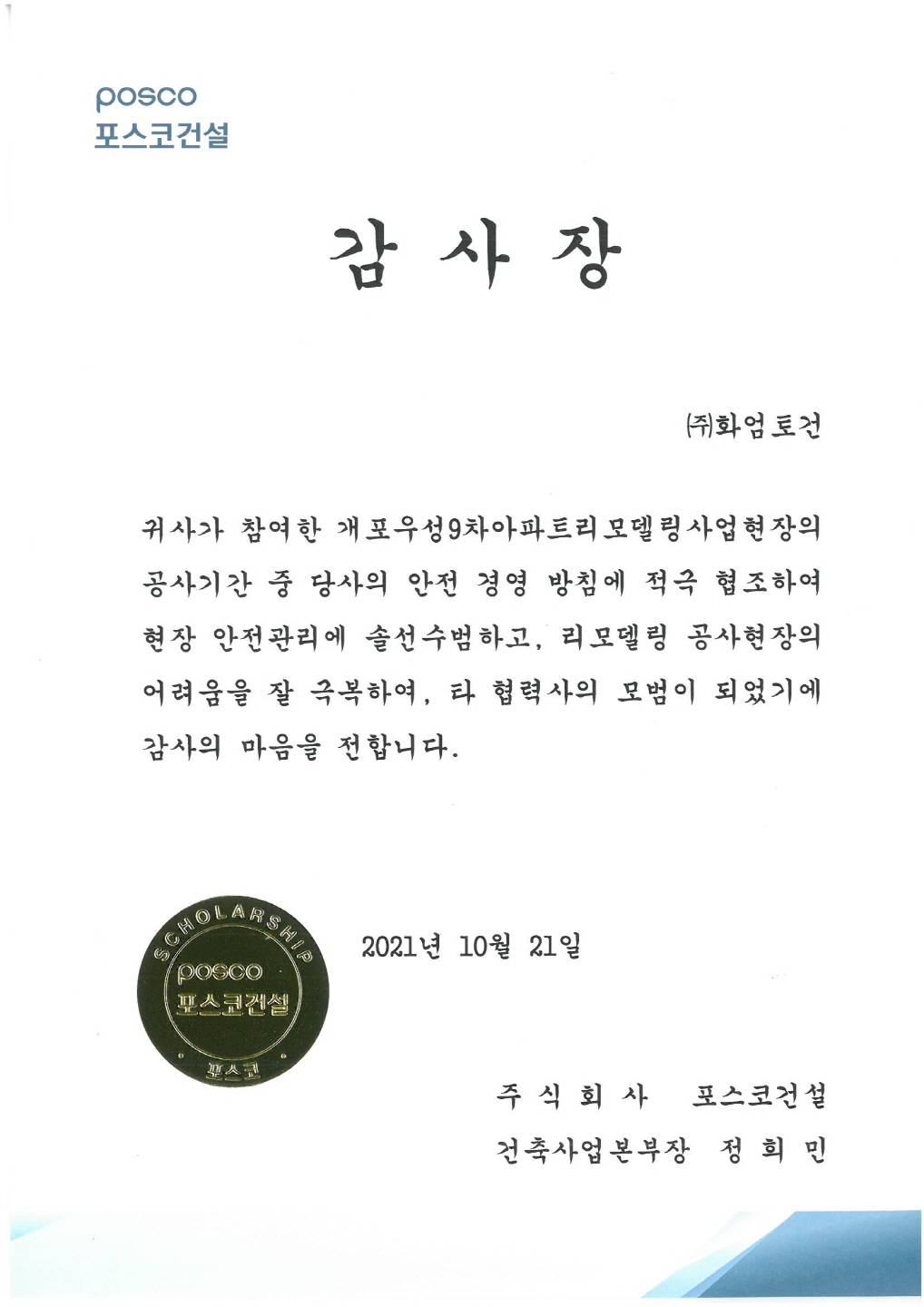 2021년 10월 21일 (주)포스코건설 감사장을 수상하였습니다.